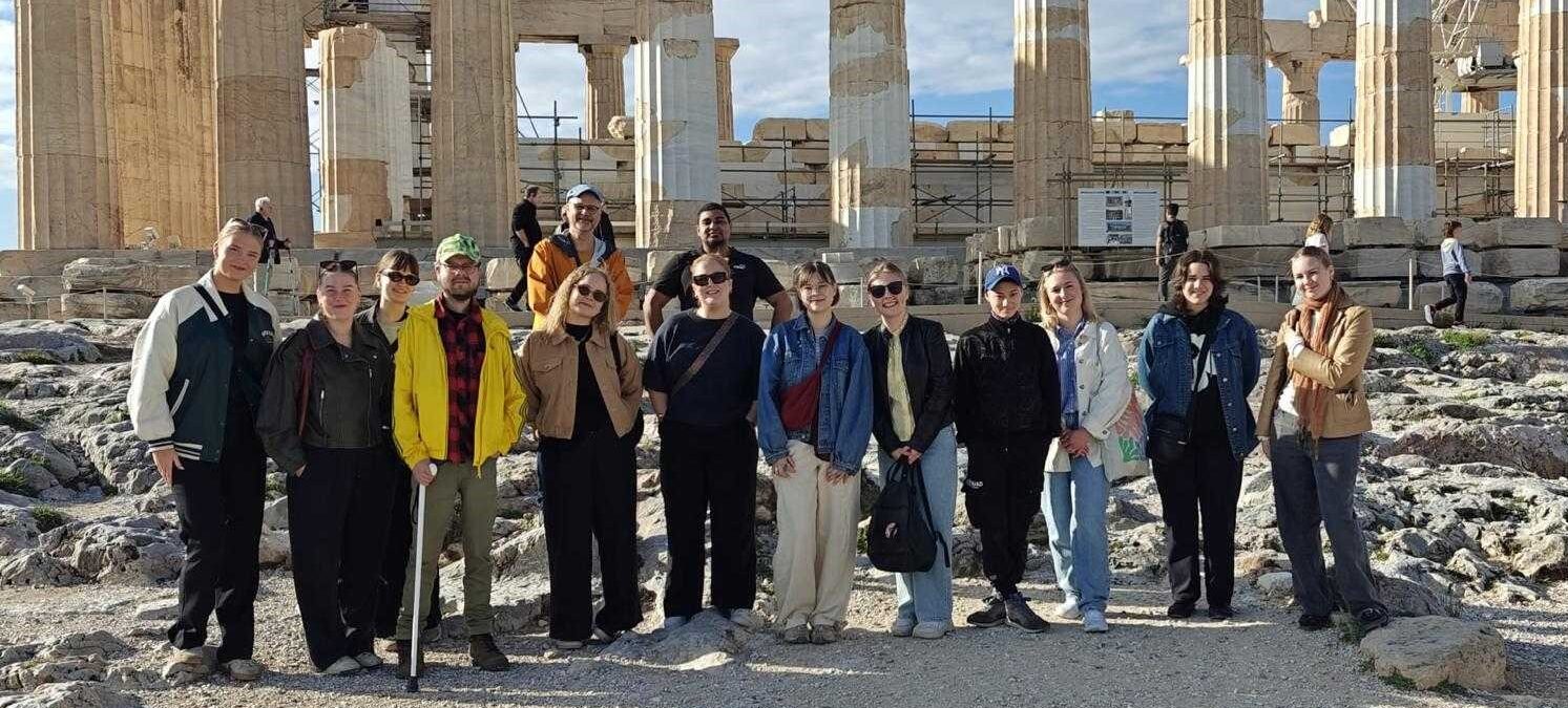 Tidigt på morgonen den första april tog vi oss till Helsingfors-Vanda flygplats. Även om det verkade lite för bra för att vara sant att vi verkligen skulle åka till Aten var det ändå inget aprilskämt. Gruppen bestod av 12 studenter och två lärare som sedan förväntansfyllda landade i ett varmt, om än ganska blåsigt, Aten. Målet med resan, likt andra religionsvetenskapliga exkursionskurser vid Åbo Akademi, var att öka förståelsen för andra kulturer och religioner genom att möta personer och besöka platser som hör till dessa religioner. De faktiska mötena med personer fick vi mer av senare under resan när vi bekantade oss med modern grekisk religiositet och diskuterade religion med troende greker. Vårt första möte var dock med platser som inte kunde säga något, men som ändå berättade mycket om det historiska religiösa landskapet i Aten, nämligen Akropolis och den antika Agora.