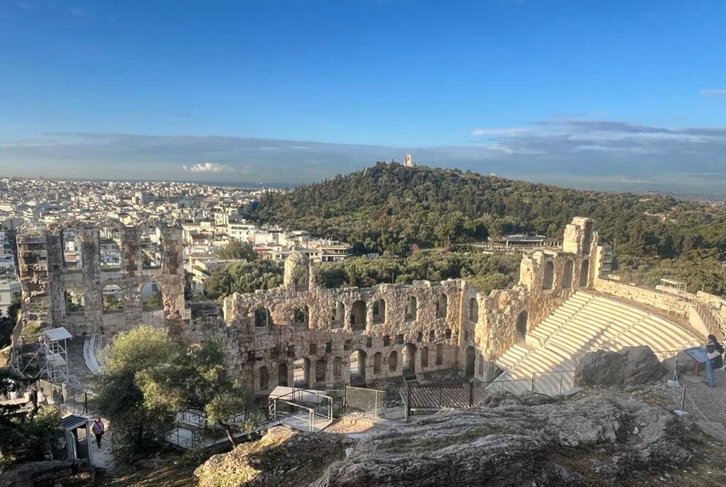 Utsikten till Philopappos kulle och den antika stenteatern Odeum of Herodes Atticus vid Aten Acropolis. Foto: Julia Flinck